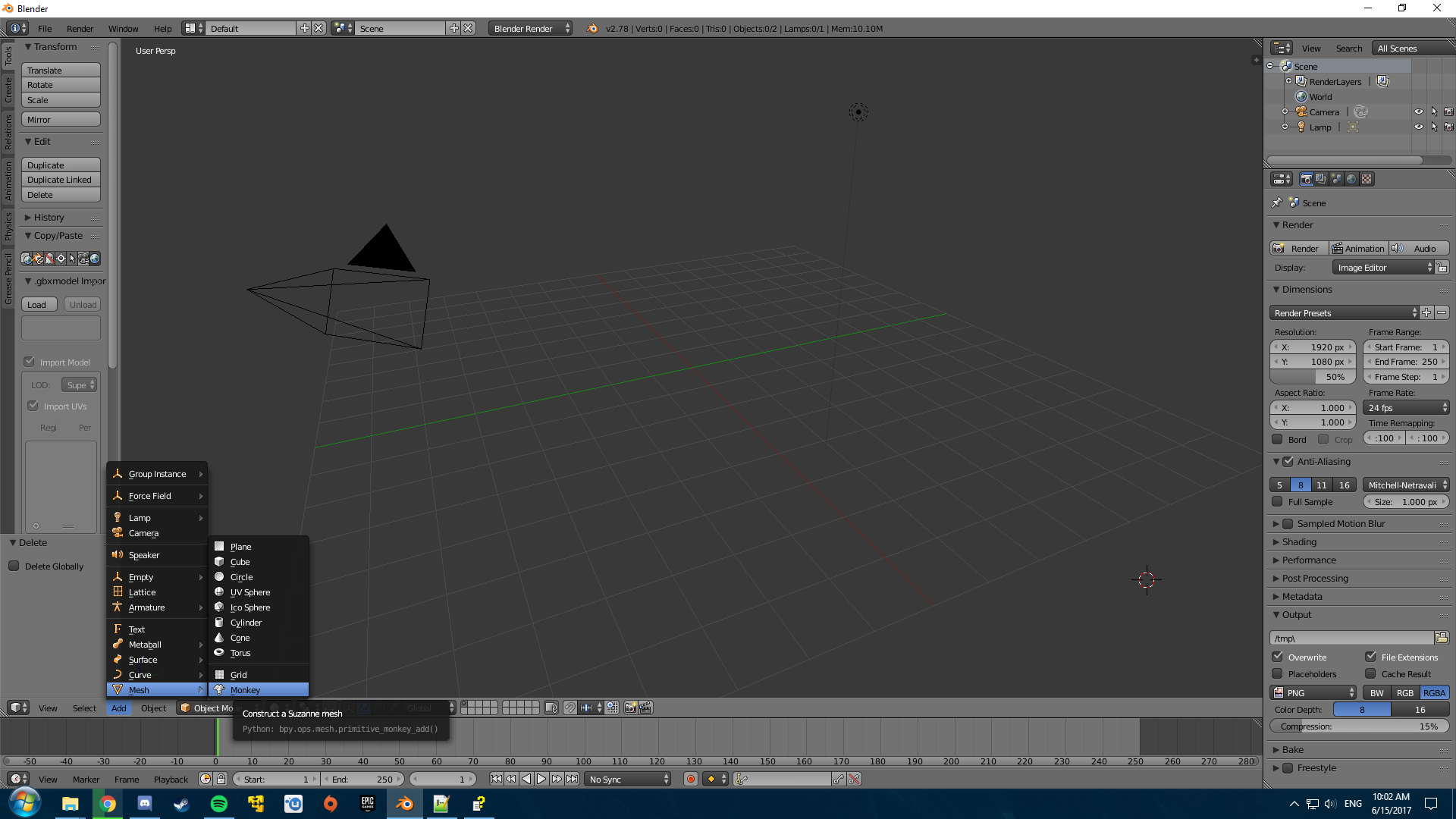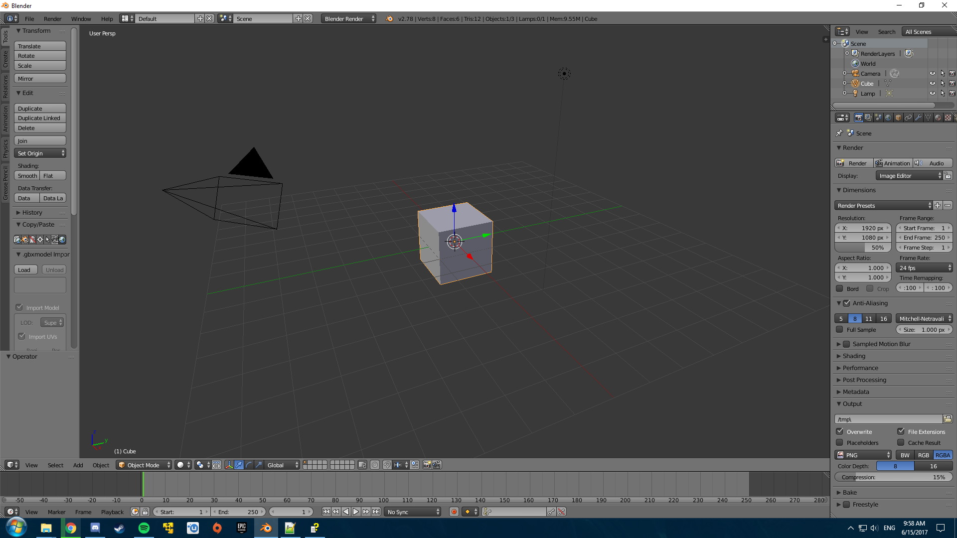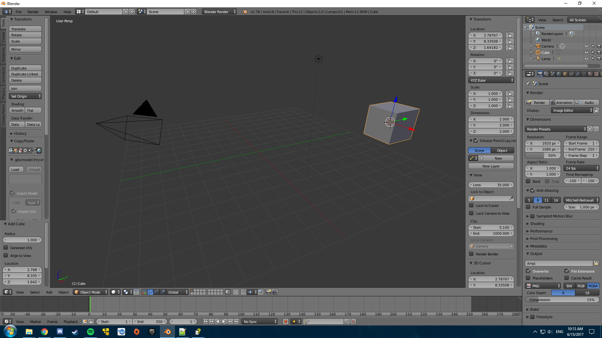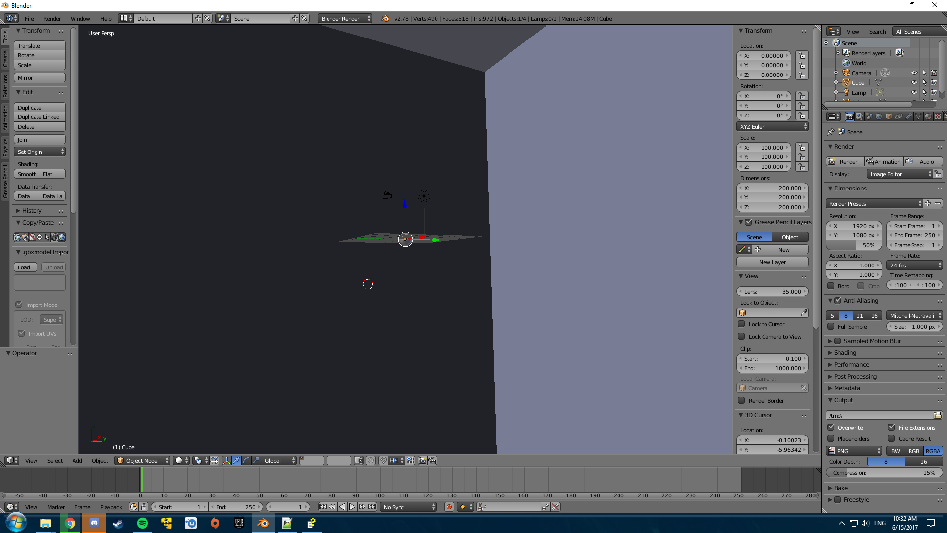 Start Blender and you should see your Scene which should look something like this at start by default.