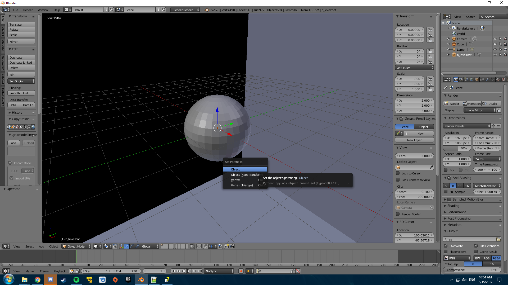 Now let us link the level to the frame node by making the frame node a parent of the level. Begin by selecting your cube then using SHIFT+RIGHT MOUSE CLICK in the scene or simply click cube in the and then SHIFT+LEFT MOUSE CLICK in the outliner. Remember that... Orange with white text = Parent Orange with black text = Child The last object selected will always be the parent. Now hit the hotkey CTRL+P and select Object. Your steps should look something like this.