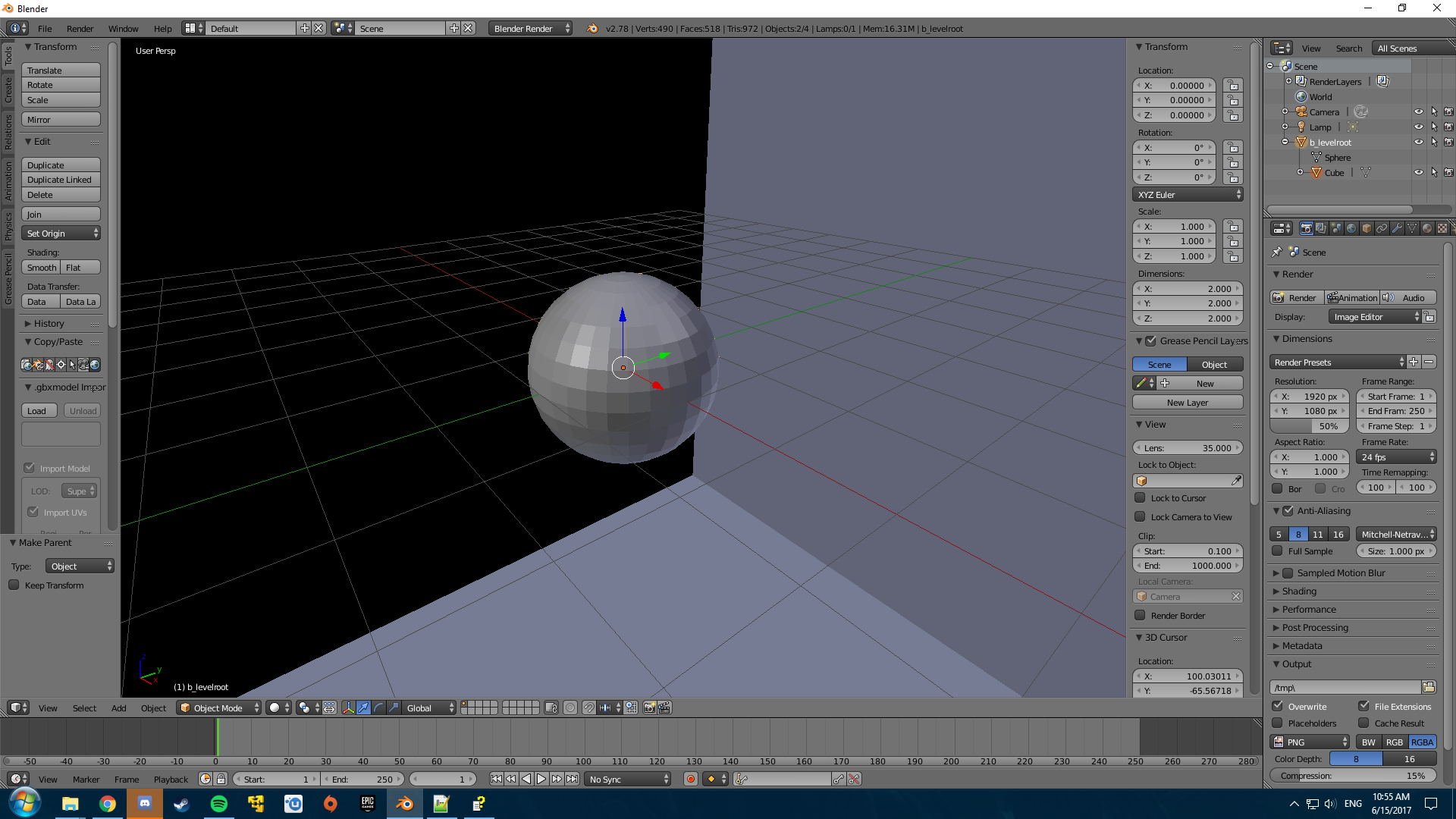 Now that was have our basic level let us begin to create our frame node. The frame node is an object that is the origin of our map and should have all objects you want exported connected to it. Take great caution to ensure all objects you want exported are linked to the frame node or they will not be exported. Take the UV sphere you created earlier and change the name of it by double clicking the current name sphere and rename it b_levelroot. The object must be named b_levelroot as this is the name of the object Halo 2 uses to orient the level. Not doing this properly will result in issues. Make sure to not move your frame node after you start to setup your player and weapon spawns as this could lead to things being displaced.