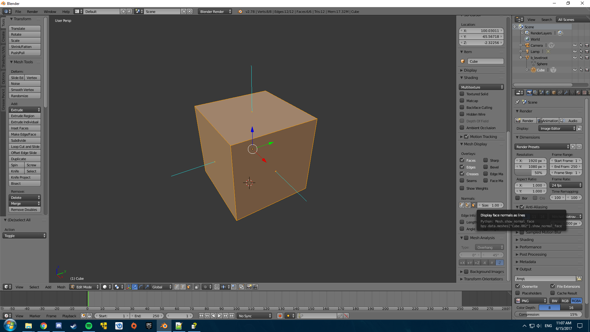 One fantastic way to see which way normals are facing is to enable a little option in the properties window. Scroll down and select Display Face Normals As Lines. Change size to 1 to easily see the way normals are facing. This is what it should look like.