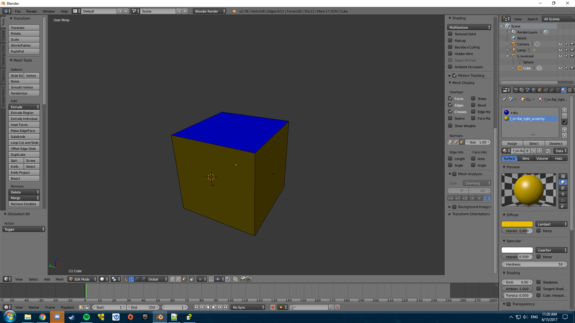 Select your cube and change the interaction mode to edit mode. This will allow you to modify the faces of the cube individually and extensively. Make sure to also select face selection. This is what it should look like.