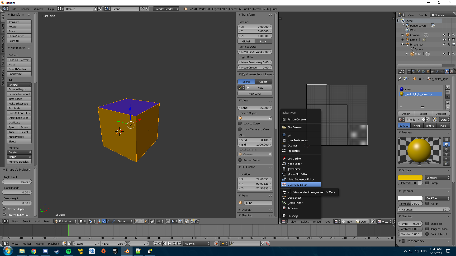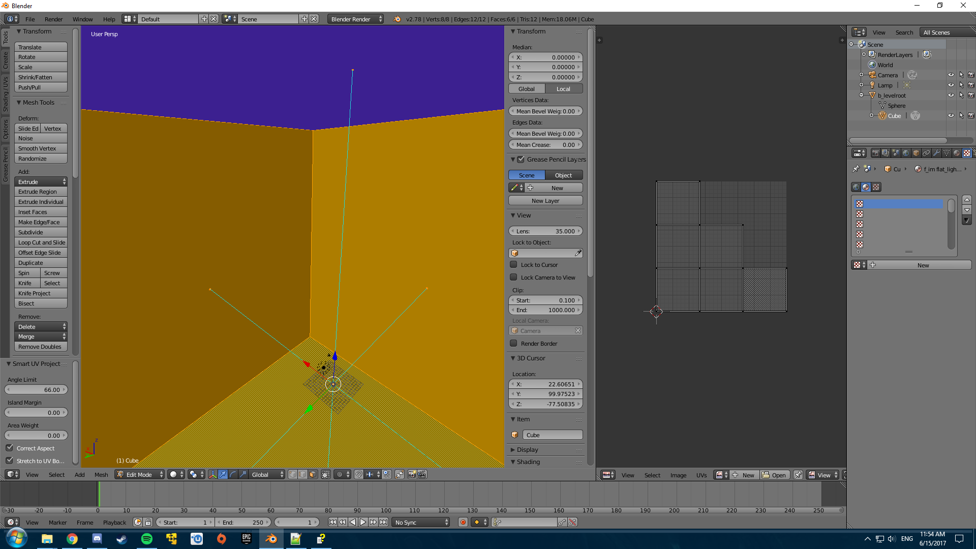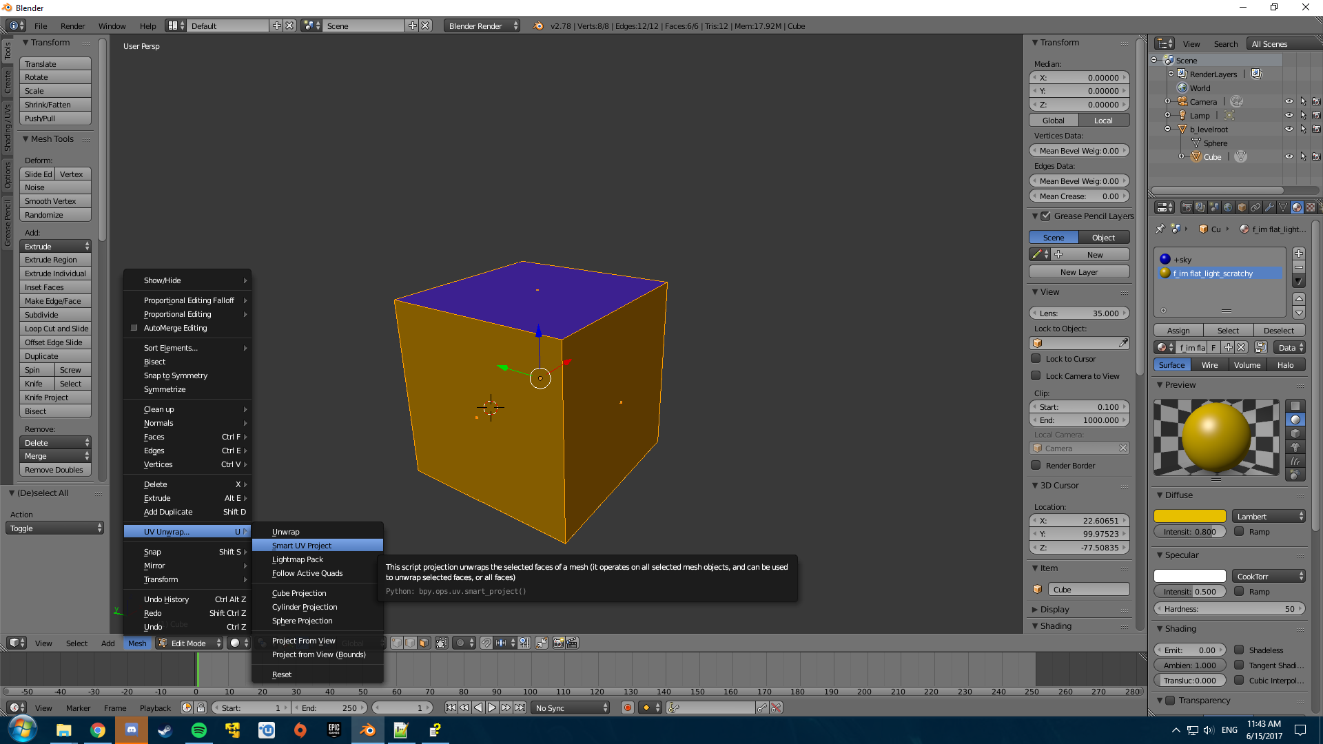 Now we have to unwrap our mesh so that we can change the size and location of the textures. Select your entire mesh by hitting A and then you have two ways to unwrap it. On a simple object like ours a simple Smart UV Project will do. On more complex shapes such as that of standard Halo maps we can use a mixture of marked seams and unwrap. We will use Smart UV Project for now and the second method will be displayed after this. After you have selected your mesh then go down to Mesh->UV Unwrap-> Smart UV Project. The accompanying images will show you where.