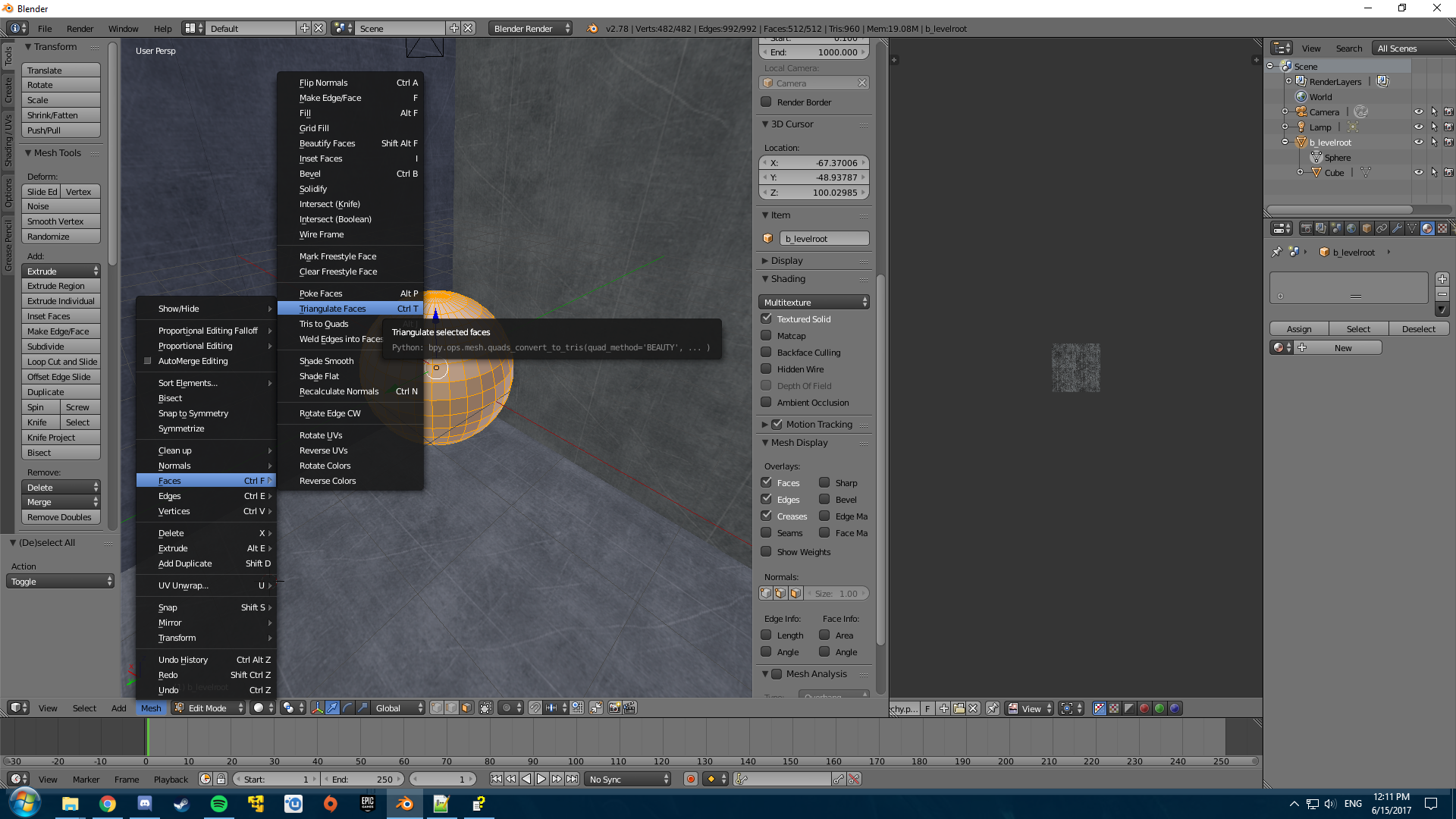 Now if this was 3DS Max you would be about ready to export the final product. This is Blender though and a few extra steps must be taken. These are crucial for the map to export properly so follow them closely. Let use first zoom in on our b_levelroot using the hotkey . to zoom in. Every single object you make in Blender must have its faces be converted to triangles. This is important as the exporter and Halo 2 will not accept it otherwise. Select your b_levelroot and go into edit mode then hit hotkey A to ensure it selects all. Go to Mesh->Faces->Triangulate Faces. Your UV sphere should be made out of triangles now.